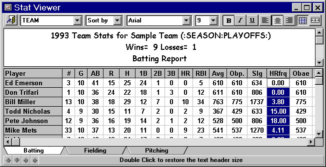 Click the tabs to view team batting, fielding or pitching reports. Double click any column to sort. Choose any Windows Font.