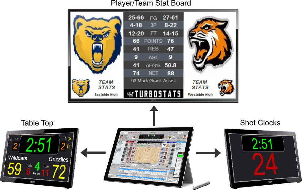 Let TurboStats update your scoreboards and shot clocks. Simply connect your tablet to LCD monitors that can support a Windows extended display, and your scoreboards and shot clocks will synchronize with TurboStats live game scoring instantly.