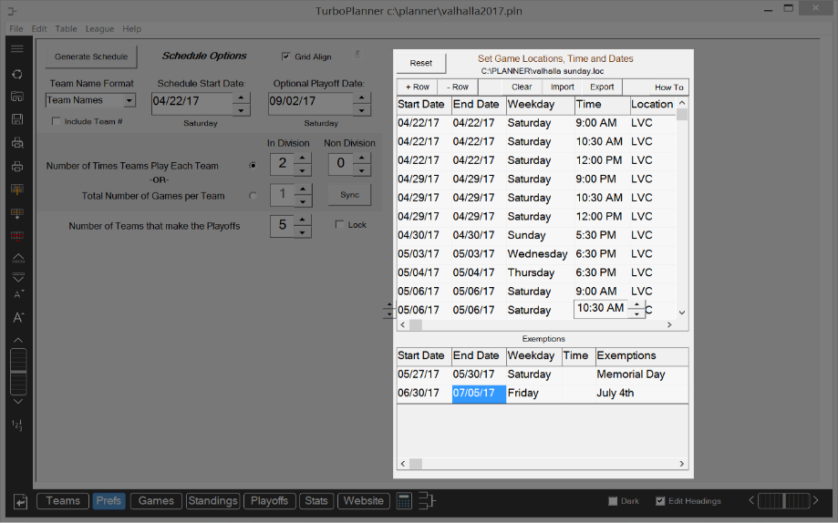 Set game locations, exemptions and create your