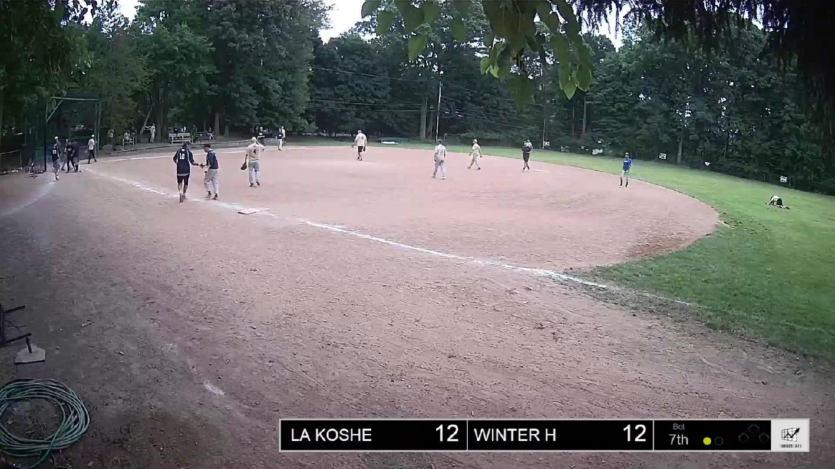 La Kosher Oh No. Winter Hill Gang comes back with 11 runs in the 6th and 7th innings to complete the comeback. LKN was up 9-2 in the 6th but some bad hops and close calls opened the door for a Winter Hill comeback. Trailing 12-8 in the bottom of the 7th, Josh Berliner came through with a lead off single. Mark Davis doubled and with one out Kevin Rosin hit a grounded that the short stop mishandled. Then Jim Halpin(3-4)and Lou Coppa (3-4) both worked a walk putting the tying run at 2nd with only one out. RJ Leonard picked a good time to get his first hit of the game and both runners scored to tie it 12-12. Rick DelGizzi singled home Jim Halpin and Winter Hill walks off with an improbable comeback. Rookie Alec Vigil was 4-4 for WHG and Rick DelGizzi was 4-5. The gimpy Mark Davis was 3-4. For LKN Brian Cass, Max Metz, Evan Orris and Derek Margiotta all had 2 hits.